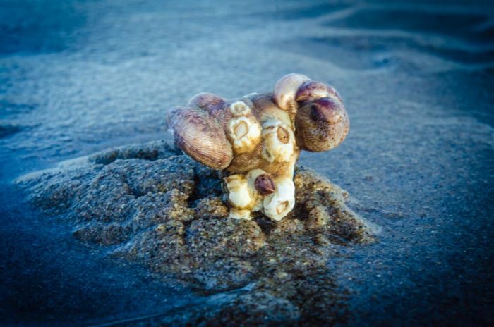 Well, it’s a band of molluscs made up of three common slipper shells stacked on top of each other on top of an empty sea shell with a few barnacles sprinkled between them with an slipper on top of one of them and another two slippers on top of each other.