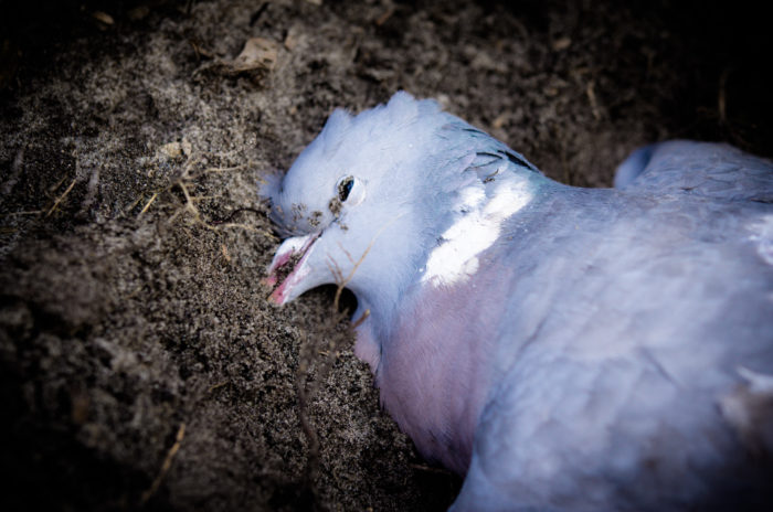 On my way to the market I follow the sun-kissed sidewalk that leads me along the blossoming trees. There, right there, lies a little pigeon on the cobblestones. Her eyes are still open… whatever happened to her must have happened just a moment ago. It looks like she might blink and look up at me. But she does not move, so I gently wrap her in a paper bag and carry her to the woods nearby. I can feel her warmness against my skin. When I find a quiet spot underneath the ancient dune oaks, I bury her there – blue feathers on cold, dark earth.