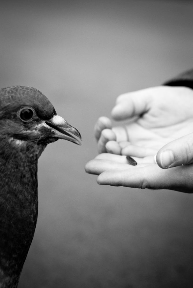 Kneeling on the ground, the pigeons eating sunflower seeds out of my hand, I noticed a mother and child approaching. “Look, she is taking photographs of the pigeons”. When I looked around the boy was standing behind me. I asked whether he wanted to feed them too. He did. I gave him some seeds and he held his tiny hands out. It was a serene moment filled with friendship.