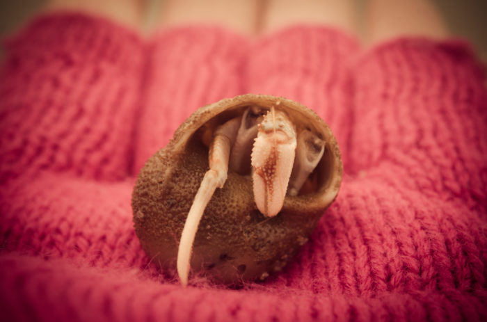 Autumn is here. Instead of bathing suit, I now wear extra layers of clothing to the beach. Splashing through the water in my wellies, I notice a seashell rolling over the sand. I pick it up and find a little hermit crab inside, hidden away. How exciting to meet such an extraordinary creature! With great care I return her to the sea and hope that she’ll make it.
