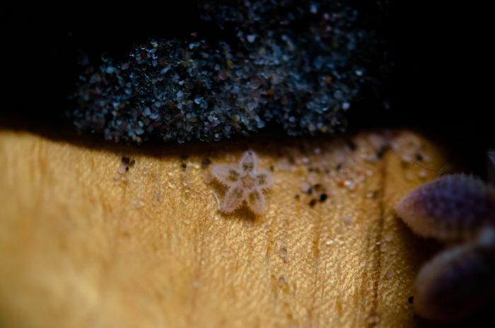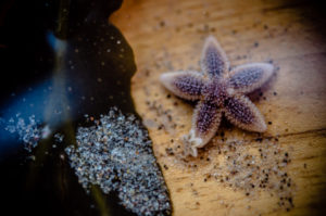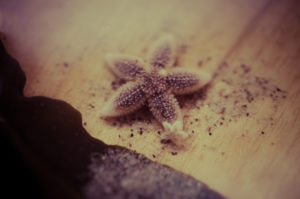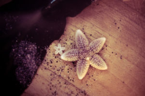 A silk evening at the beach, people walking hand in hand as the sun descends. Somewhere between the pebbles lies a tall, green leaf. On it the smallest starfish I’ve ever seen. Her pink arms holding on tightly to her makeshift raft. There are no signs of life, exposed to the air for too long. I carry her with me for a while, not sure what to do. When I get to my bike, I decide to bring her along a little further. At home I put her in some saline water, just in case I missed something. Then out from under her comes… a baby starfish! I can’t believe my eyes. She must have been carrying her with her. What a miraculous sight. I shall burn some incense for them: a wake for the stars.
