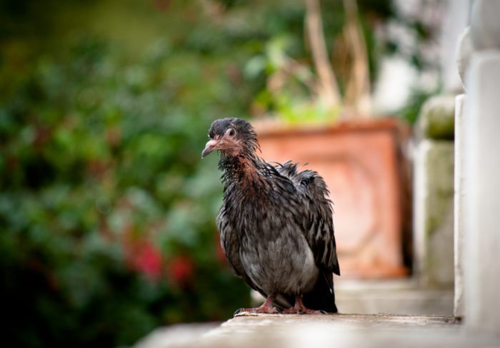 Boink. I look out my window and see this pigeon on the outside ledge. She must have just flown against the window. What in god’s name has happened to her? She looks like she was attacked and then drowned. I grab my keys, my phone (to call the animal ambulance or rscpa; I’ll have to look it up – most important thing is to get her off the ledge and inside) and run outside with some bird food. I put it on the edge of the ledge, but she keeps walking up and down without getting close to me. There is no way I can reach her and she obviously is so out of it that she can’t fly. After 15 minutes I give up and get my camera. 15 min later I am still wondering what to do. Then, she suddenly spread her wings and flies off.