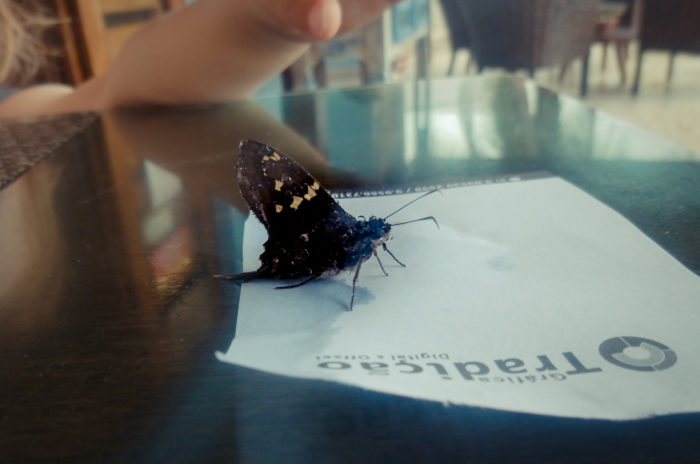 We were enjoying our breakfast, when all of a sudden it started pouring down. From the veranda we watch as the raindrops fell around us. Then I noticed a butterfly in the garden, who got caught in the rain… their wings completely soaked. I ran inside to find a piece of paper and carefully scooped them up. Huddled around the table, we waited for it to stop. When the clouds parted, they were ready to fly out into the blue sky.