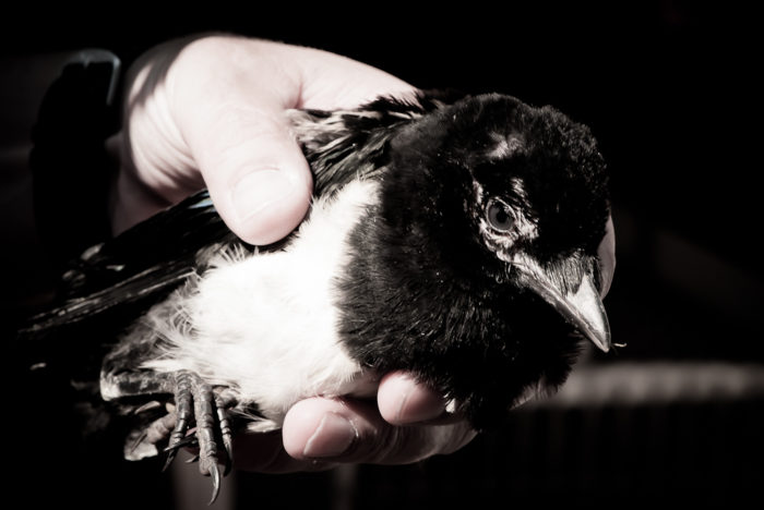 Walking along the maze, we found a dead magpie lying on the path. We went closer to take a look and see if we might bury her nearby. Suddenly she moved her head. Taken by surprise, we decided to save her from certain death. She desperately tried to get away and hide under the bushes, but we managed to scoop her up. She immediately started crying, but as I pressed her against my chest, she closed her eyes and rested her head. We could see scars on her face from some creature who had attacked her. We tried to see if she had perhaps fallen out of a nest and if her parents might be looking for her. No one in sight, so we called Animal Rescue and they promised to pick her up. We waited patiently until they arrived, and were happy to hear that she might make it.