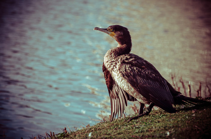 An usual sight at the pond this morning: a cormorant! As I get a bit closer, I notice she has a limp. A piece of metal is sticking out of her left ankle. Given that she looks quite young – her feathers not yet black – and that no one else of her family seems to be around, I give Animal Aid a call just to be on the safe side. They offer to come take a look when they’re in the neighbourhood. I sit down by her side and together we enjoy the sunshine. It’s still pretty cold out, so every once in a while I get up and leap around the field. The youngster stays put, occasionally begging for food as chicks do. Forty minutes pass. And then, completely out of the blue my protegee takes off and dives into the water! Just as the Animal Aid van pulls up. After a chat, they decide to give it a shot. With a fishing net we follow the little one from here to there, and back again. As she rushes away, it’s clear: it ain’t gonna happen. We should just let her get on with things…