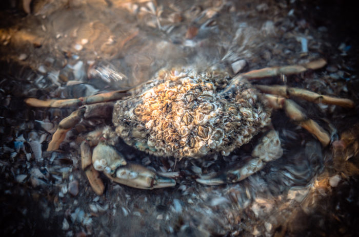 Strolling along the beach, my feet just submerged in the water, I came upon a rather large rock. It caught my eye, cause you don’t see too many of those. Intrigued, I bend down and touched it. To my surprise it moved slightly. It wasn’t a rock… but a crab covered in barnacles, hiding underneath the sand! Out came her six legs, as she scurried sideways towards the sea. I marveled at the sight and wondered what’s it like to live laterally.