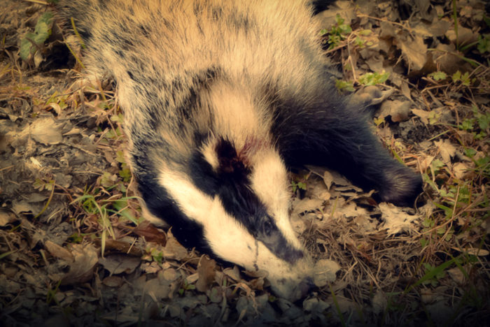 Driving home from a walk in the forest, I saw a dead animal lying in the shoulder of the road. I thought it was a raccoon and we stopped for a moment. We drove a bit further, then stopped again, stepped out and walked back to take a look and see if we could do something. Coming closer, Wistful Oak thought it was a little wild boar, but seeing her head I knew immediately knew it was a badger. In all the years we have live here, we have never have seen one, and now we found a one dead. Probably driven over by a motorcar. We decided to give her a better resting place. Wistful Oak lifted the animal up and found out how heavy the poor beast was. He moved her down the slope and – still not yet satisfied to leave her there – moved her again and covered her with dead wood.